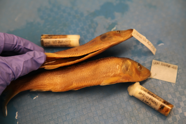 A researcher holds open a preserved fish specimen that has been inspected for parasites. The study included eight fish species and 699 fish specimens, which yielded more than 17,000 parasites. (Photo Credit:Katherine Maslenikov/UW Burke Museum)