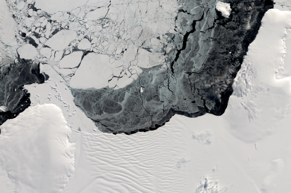 Getz Ice Shelf of the Amundsen Sector, West Antarctica, and sea ice offshore. (Photo Credit: ©NASA/USGS, processed by Dr Frazer Christie, Scott Polar Research Institute, University of Cambridge.)