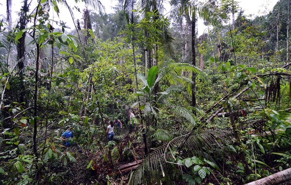 Members of NGEE-Tropics visit what they named “Blowdown Gardens,” an area that experienced windthrow near one of their field sites in the Amazon. Researchers have found a relationship between atmospheric conditions and large areas of tree death. (Photo Credit: Jeff Chambers/Berkeley Lab)