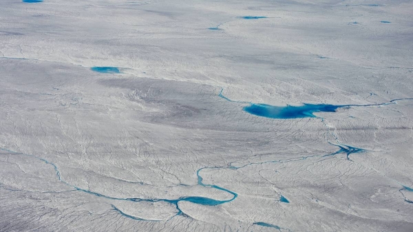 Image: Melt Ponds at the Greenland’s Ice sheet margin, flight to Kangerlussuaq, end of June 2012 (Photo: Sepp Kipfstuhl)