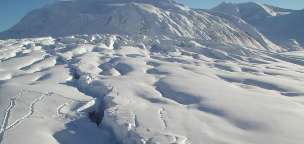 Photo: Denali fault trace cutting through Gakona Glacier, just after the 2002 earthquake. Tracks are from where geologists measured the fault offset. Photo Credit: Peter Haeussler/U.S. Geological Survey. Licensed under Public Domain.