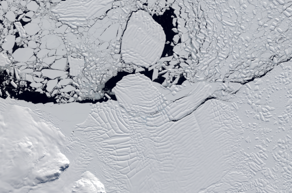 Landsat 9 satellite imagery shows the fractured front of the Crosson Ice Shelf in the Amundsen Sector of West Antarctica. The pace of the ice shelf’s retreat slowed in this region from 2003 to 2015. New research shows that changes in offshore winds brought less warm seawater into contact with the glacier.(Photo Credit: NASA/USGS and Frazer Christie/University of Cambridge)