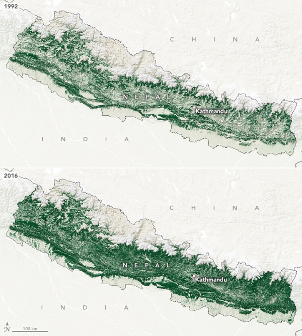 The maps above show forest cover in Nepal in 1992 (top) and 2016 (bottom). Between these years, forest cover in the country almost doubled, from 26 percent to 45 percent. Using the long-term data record from Landsat satellites, along with in-depth interviews with people in Nepali villages, the research group found that community forest management was associated with the regrowth of forests. Most of the tree regrowth happened in middle-elevations, in the hills between the Himalayas and the plains of the Ganges River.