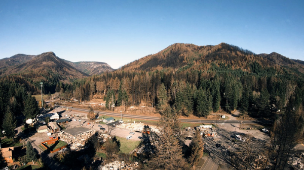 Fire damage in the city of Detroit, Oregon, and the Oregon Cascades can be seen in this aerial image. Photo courtesy Oregon State University. (Photo Credit: Oregon State University)