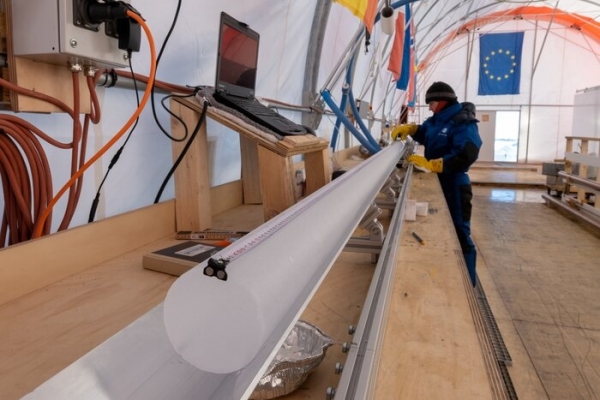 Image: A freshly drilled ice core is measured. (Credit: © PNRA/IPEV)