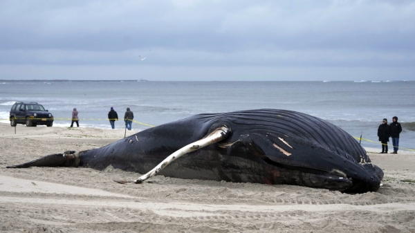 A dead humpback whale in Lido Beach, New York on January 31, 2023. (Photo Credit: Seth Wenig / AP Photo)
