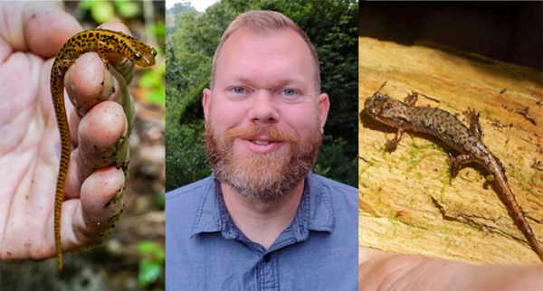 College of ACES researchers, including Sam Stickley (pictured), found plethodontid salamanders may not decline due to climate change as much as originally predicted, based on older species distribution models. Re-running those models using microclimate data more relevant to the salamanders' habitat, the researchers found less decline and even some areas where the amphibians may gain habitat by 2050. (Photo Credit: Sam Stickley, University of Illinois College of ACES.)