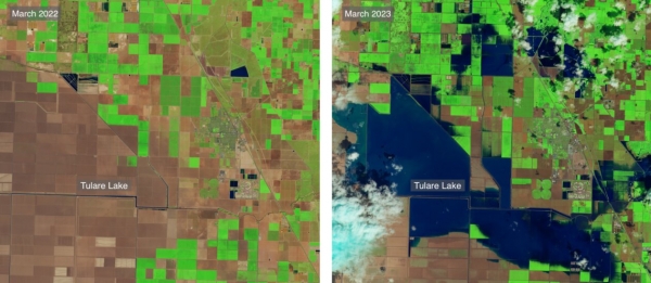 Image: The footprint of Tulare Lake in March 2022 and March 2023, after floodwaters inundated the area. (Credit: YALE ENVIRONMENT 360 / NASA)