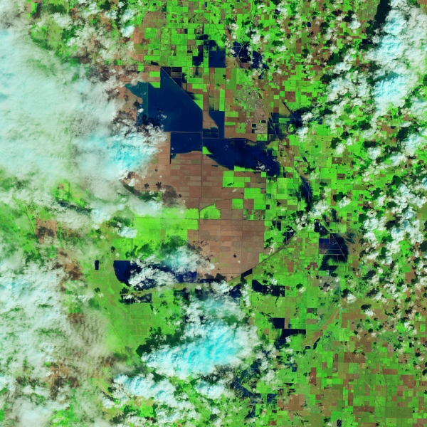 Floodwater (dark blue) stands out against the vegetation in agricultural fields around Tulare Lake near Corcoran, California, in this enhanced color image taken by Landsat 8 on March 29, 2023. Heavy rain and snow in the first three months of 2023 have once again brought water to Tulare’s lakebed, but also flooding several nearby towns. 2023 has been the wettest year in the region’s history.