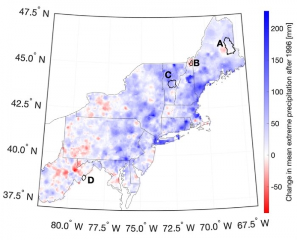 Image: Map showing the average change in annual extreme precipitation 1996-2011 compared to the 1979-1996 average. Watersheds analyzed are outlined in black: (A) Mattawamkeag River in Maine, (B) Dead Diamond River in New Hampshire, (C) White River in Vermont, and (D) Shenandoah River in West Virginia. (Credit: Figure by C.Cockburn et al.)