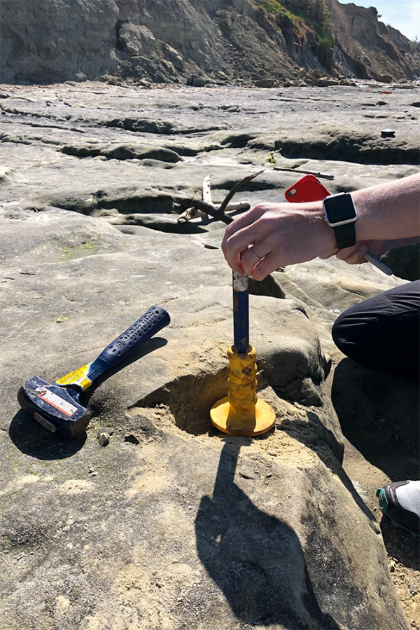 Jane Willenbring sampling shore platform bedrock in Del Mar with a hammer and chisel. (Photo Credit: Travis Clow)