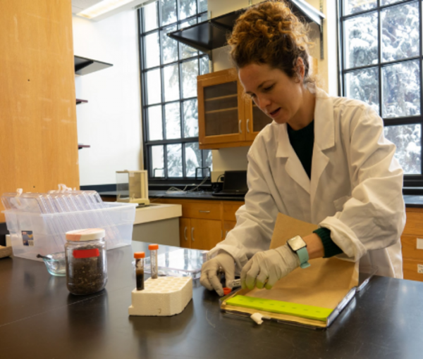University of Colorado Boulder Ph.D. student Corinne Walsh works with soil samples containing microbes associated with wheat plants. A new machine-learning approach may help microbial ecologists like Walsh figure out the environmental preferences of bacteria from a quick look at their genomes, making some lab work more efficient and agricultural science more successful. (Photo Credit: Cooperative Institute for Research in Environmental Sciences (2020))