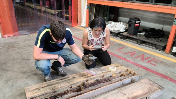 Image: Tom Shea and Nabila Nizam with Kīlauea Iki cores. (Credit: University of Hawaiʻi at Mānoa)