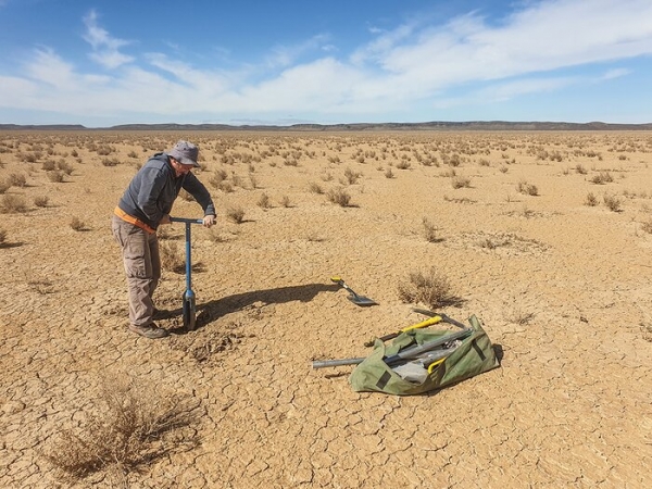 Image: Andrew Carr collecting sediment samples dating to the Last Glacial Maximum from the dry lakebed at Swartkolkvloer. (Credit: Brian Chase)