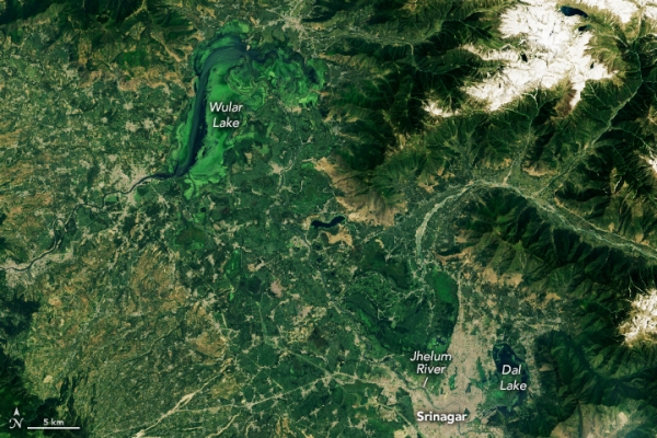 The two lakes—Wular and Dal—are visible in this image, acquired on June 23, 2020, by the Operational Land Imager (OLI) on Landsat 8. Both lakes regulate water flowing down from Himalayan glaciers and along the Jhelum River, supplying water for drinking and irrigation.