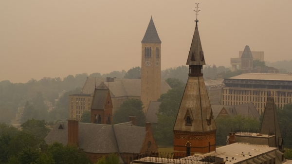 Smoke from wildfires burning in Canada shroud the Sage Hall tower, foreground, and McGraw Tower on June 7. On a clear day, Cayuga Lake would be visible. Wildfires can affect human health hundreds of miles away in distant places, professor Oliver Gao said in a recent study. (Photo Credit: Jason Koski/Cornell University)