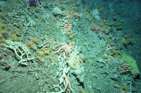 Image: Deep-sea coral garden located in the Drake Passage seamount; image captured by a remotely operated vehicle (ROV). Credit: Laura F. Robinson