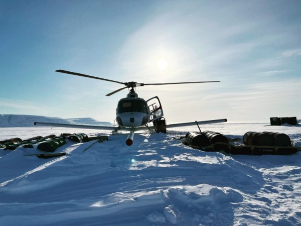 A helicopter equipped with an ice-penetrating radar refuels on the ice at the Arctic’s Devon Island. Researchers at the University of Texas Institute for Geophysics have developed a resolution-boosting technique for the instrument. (Photo Credit: Corey Skender)