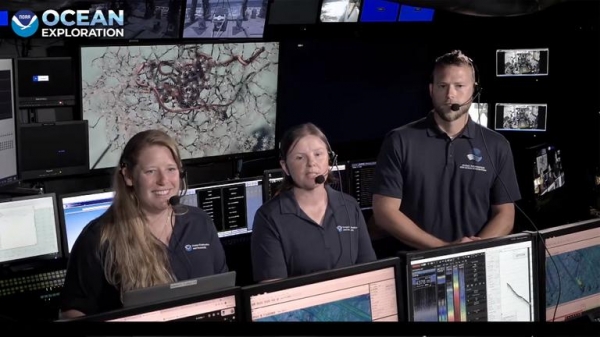 Image: From the operating room, the scientists control the underwater robot, communicate with scientists participating in the expedition from ashore, and answer questions from the general public. (Photo: NOAA Ocean Exploration)