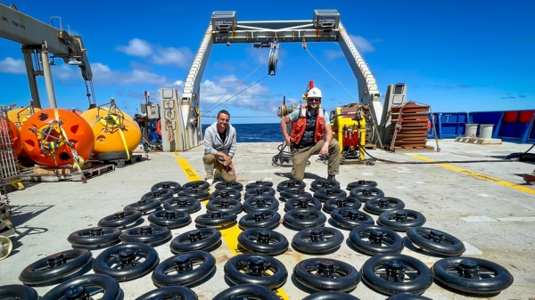 Rosenstiel School senior research associate Cedric Guigand, left, and assistant scientist Guillaume Novelli inventory some of the 200 surface drifters that were deployed during the 26-day cruise in the Cape Cauldron. (Photo Credit: Cedric Guigand)