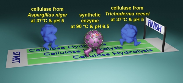 Illustration: In the race to break down cellulose, synthetic catalysts are now midway between two natural enzymes. Credit: Yan Zhao.