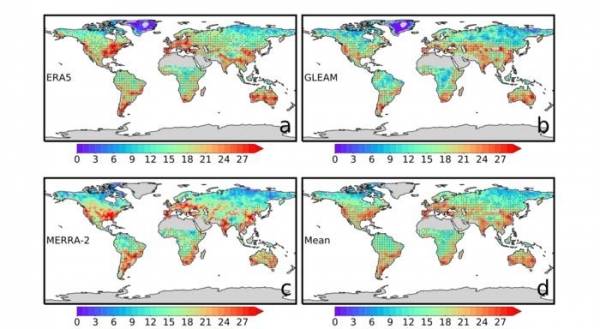 Maps depicting the total number of rapid shifts from drought to heavy rain on a global level during the period of 1980–2020. The first three maps depict results from the three global data sets the scientific team used. The fourth is the mean of the three data sets combined. (Photo Credit: Qing, Y., Wang, S., Yang, ZL. et al.)