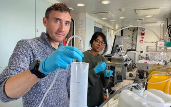 Image: Matt Salter och Snega Aggarwal during a three-day sampling expedition aboard R/V Electra analysing volatile organic compounds (VOCs) released by cyanobacteria blooms. (Photo Credit: Lisa Bergqvist)