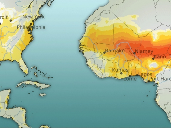 This composite map shows land areas that could face extreme heat if the planet continues to warm (indicated in yellow and orange). The darker the color, the longer the projected exposure to extreme heat. (Photo Credit: Daniel Vecellio, Qinqin Kong, W. Larry Kenney and Matthew Huber; composite image by Dennis Maney, Penn State)