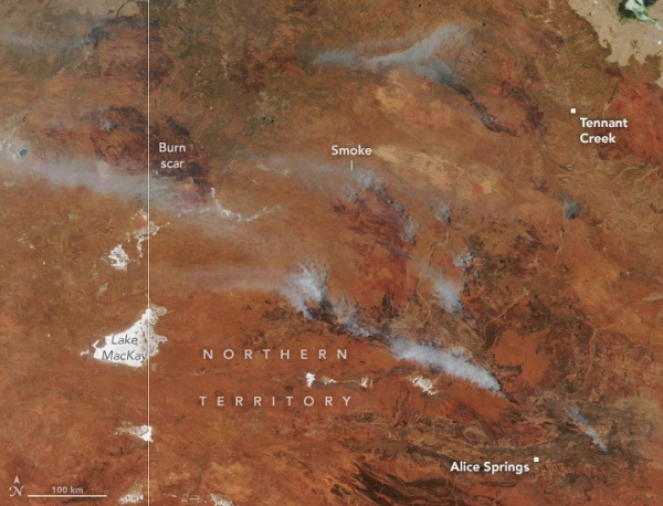 The largest plume of smoke in the image streamed from the Gillens Bore fire, located approximately 85 kilometers north of Alice Springs, along the Stuart Highway. As of October 12, the fire had burned almost 19,000 hectares (46,000 acres). Notice a burn scar on Northern Territory’s border with Western Australia. The scar is from the Tanami fire, located north of Lake MacKay, which was still burning as of October 12.