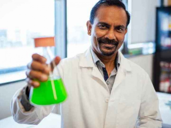 Image: Venkatesh Balan holds a flask of cyanobacteria. Its bright green color is a sign of its ability to convert sunlight into energy. But more intriguing for Balan and his team of researchers is cyanobacteria’s untapped power to capture carbon dioxide from the atmosphere. (Credit: University of Houston)