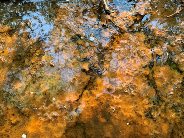 Image from a lake in Southampton, UK. At the shallow end of the lake this bright orange slime collects along the edges of the water as a result of bacteria that oxidises the iron released from the ground water. The reflection in the water of the blue sky above balances the bright oranges and yellows of the slime. Image by Jennifer Dewing from the University of Southampton, UK. (Photo Credit: National Biofilms Innovation Centre)