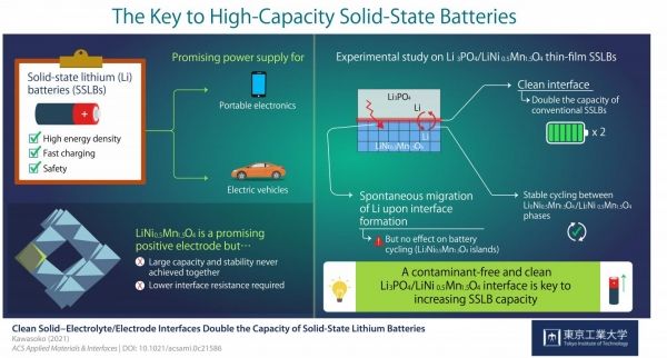 Scientists at Tokyo Institute of Technology (Tokyo Tech), Tohoku University, National Institute of Advanced Industrial Science and Technology, and Nippon Institute of Technology, demonstrated by experiment that a clean electrolyte/electrode interface is key to realizing high-capacity solid-state lithium batteries.