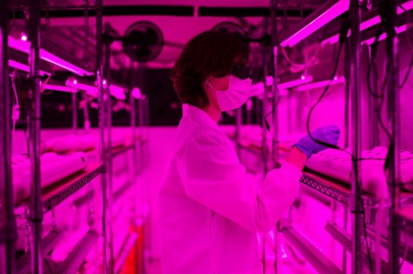 Danielle Rose works under a pop-up grow tent inside Velocity’s main incubator workspace.