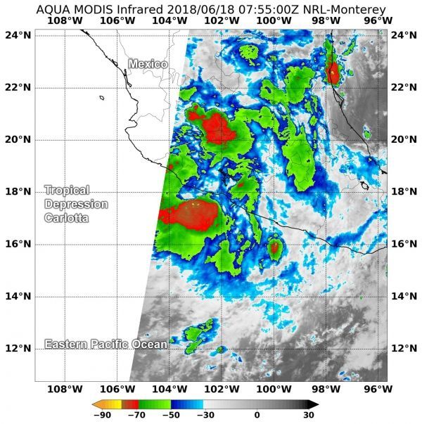 Tropical Depression Carlotta continues to hug the coast of southwestern Mexico and drop heavy rainfall. NASA's Aqua satellite provided a look at cloud top temperatures through infrared imagery to find out where the most powerful parts of Tropical Depression Carlotta were located.