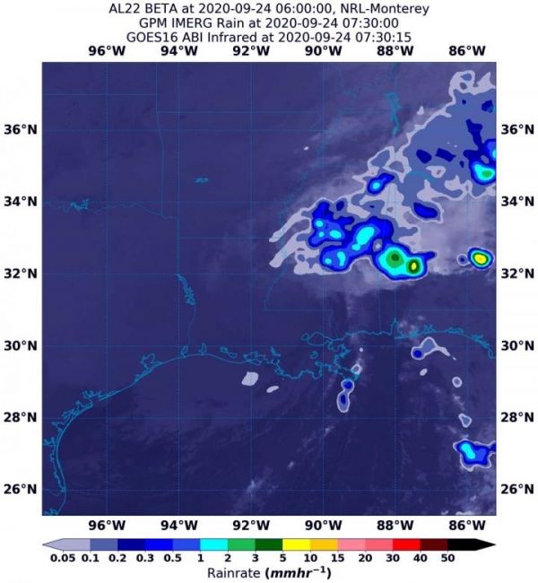 Using a NASA satellite rainfall product that incorporates data from satellites and observations, NASA estimated Post-tropical Cyclone Beta’s rainfall rates as it moved over Mississippi, Alabama and Tennessee.